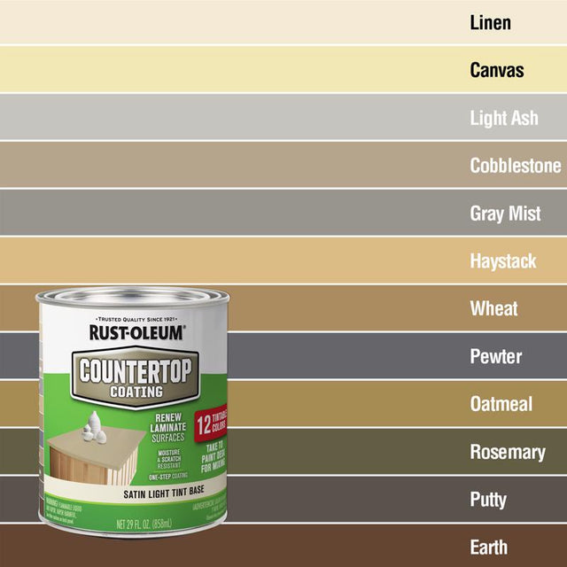 Rust-Oleum Countertop Coating Tint Base provides a protective surface for your kitchen, bathroom, workroom and more with ultimate moisture and scratch resistance. Oil-based formula includes HomeShield Antimicrobial Protection to protect the painted surface by inhibiting the growth of mold, mildew and other odor/stain causing microbes. Tint the coating to match with existing flooring, fixtures or surrounding decorative items.