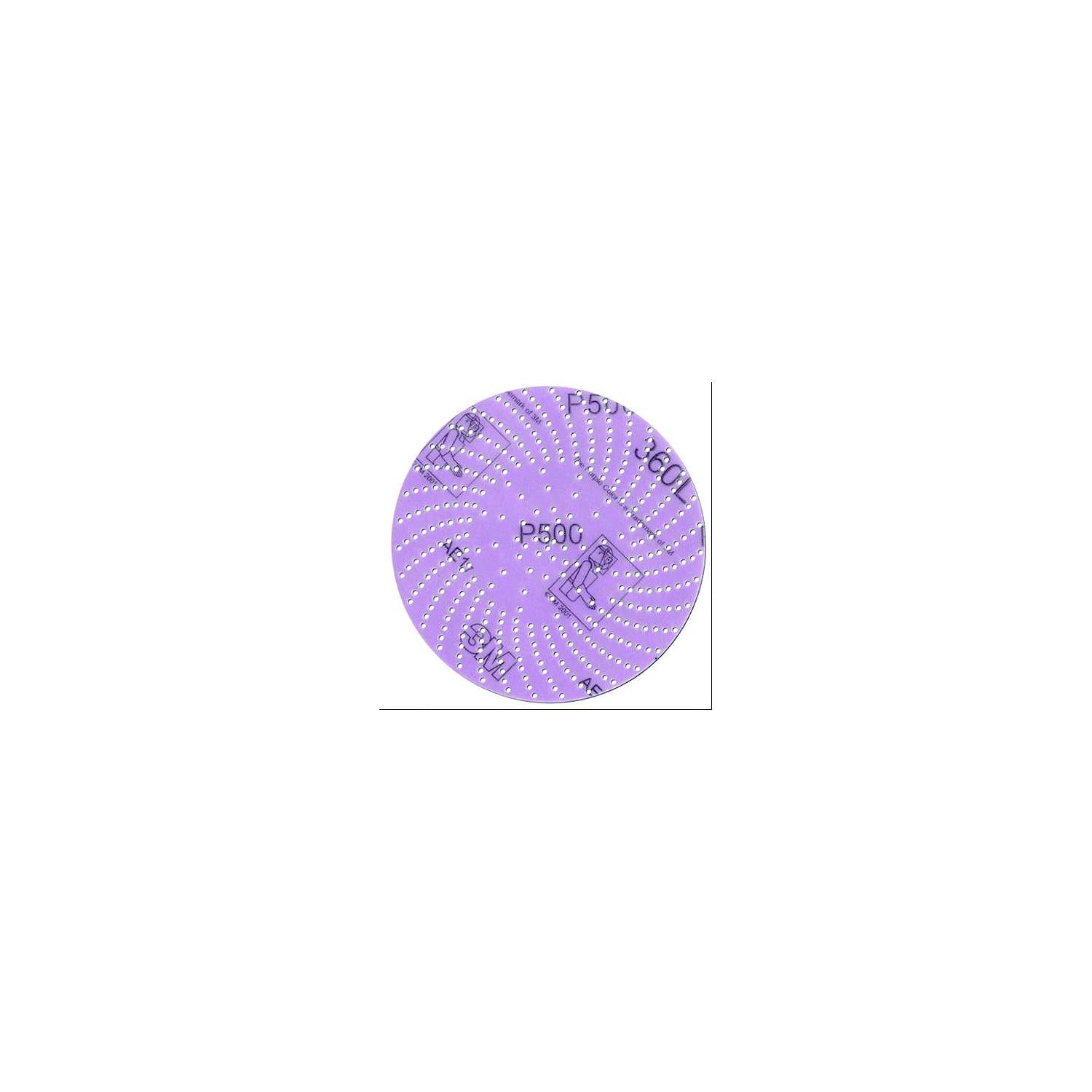 An aluminum oxide, open coat, load resistant Hookit™ disc with precise multiple hole design for improved dust extraction. Constructed on a film backing.