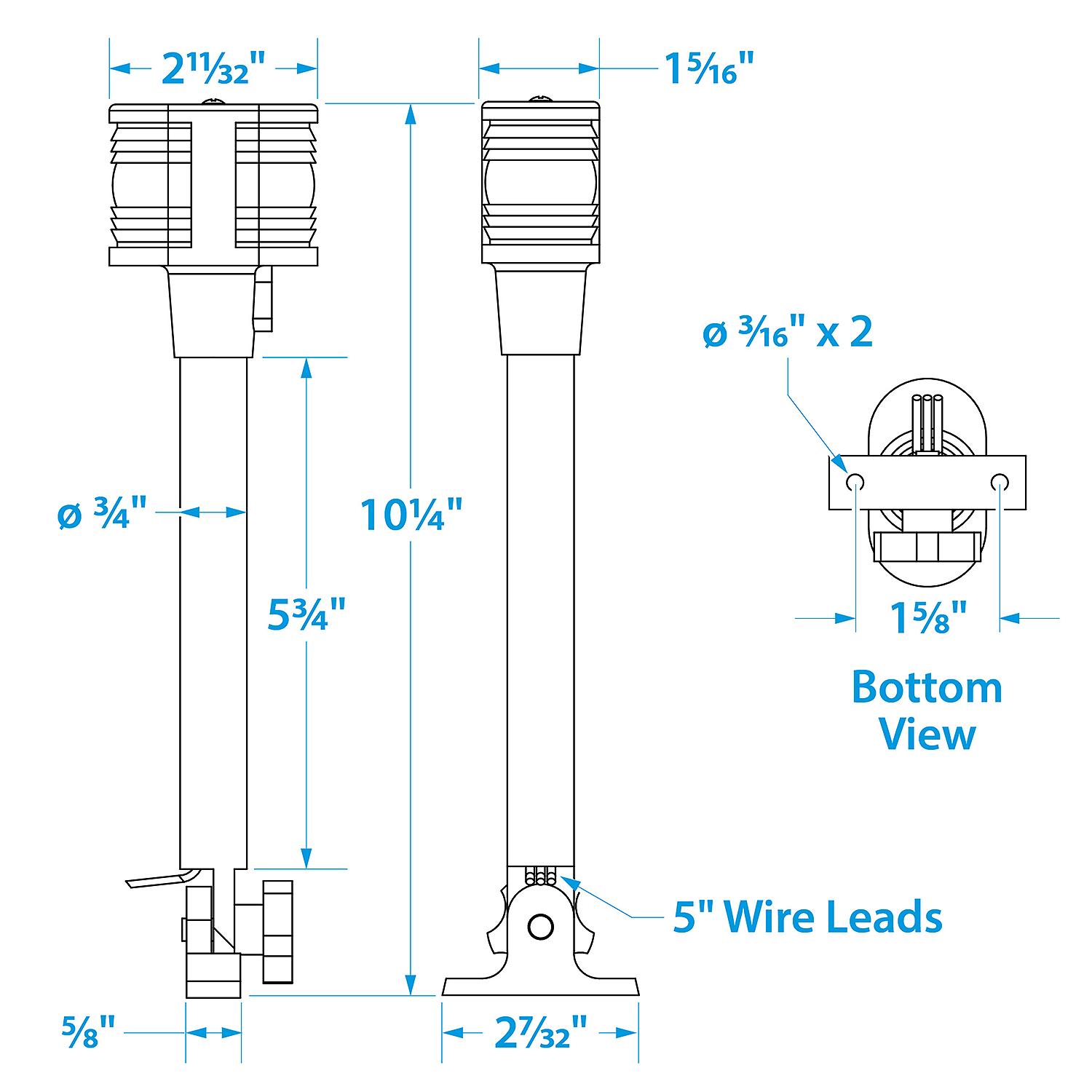 3-mile visibility for sail or powerboats under 66'. Anodized aluminum 3/4" tube with clear lenses. Two 12V DC 8 CP lamps included. Chrome plated zinc base is 2-7/32" L x 5/8" W. Pre-drilled to accommodate 2 #8 screws. 10-1/4" overall length. Two plastic adapters included for flat or "V" mount.