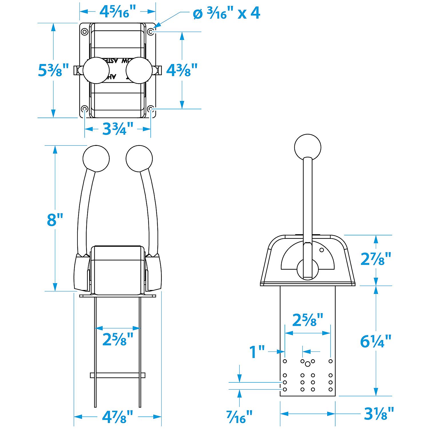Made of chrome plated brass. Each separate lever controls clutch and throttle for one engine. Functions easily identified by red and black knobs. Designed to use 33C type control cables. Shims and cable clamps are made of brass and are supplied for easy installation. Overall height 8-5/16"