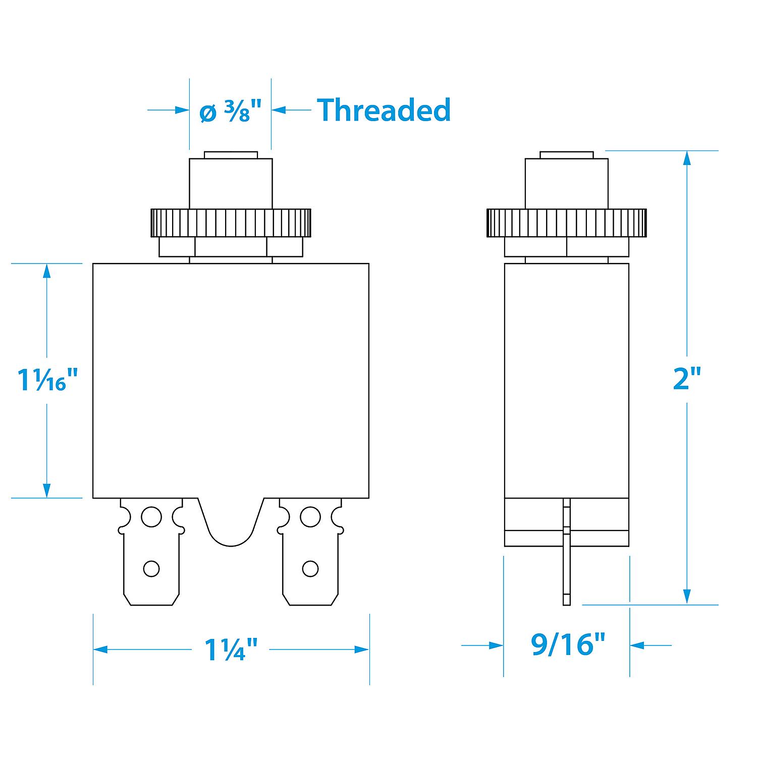 Push to reset . Calibrated and tested. Single pole circuit breakers. A proven "Snap-Acting" bi-metallic thermal sensing mechanism used to interrupt current flow. Manual push to reset reinstates current flow Max panel thickness 1/4", 3/8" hole. 1/2" W x 1-3/8" H x 1-3/16" D.