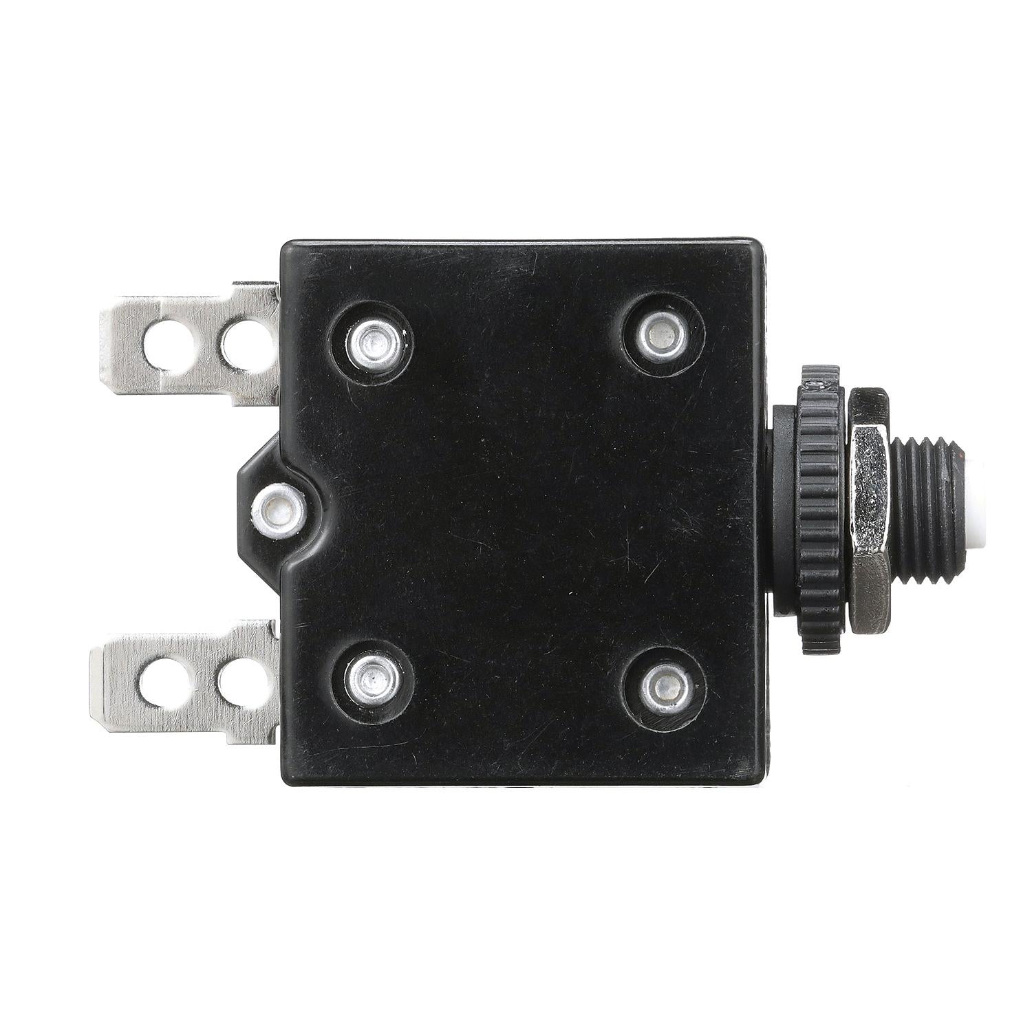 Push to reset . Calibrated and tested. Single pole circuit breakers. A proven "Snap-Acting" bi-metallic thermal sensing mechanism used to interrupt current flow. Manual push to reset reinstates current flow Max panel thickness 1/4", 3/8" hole. 1/2" W x 1-3/8" H x 1-3/16" D.