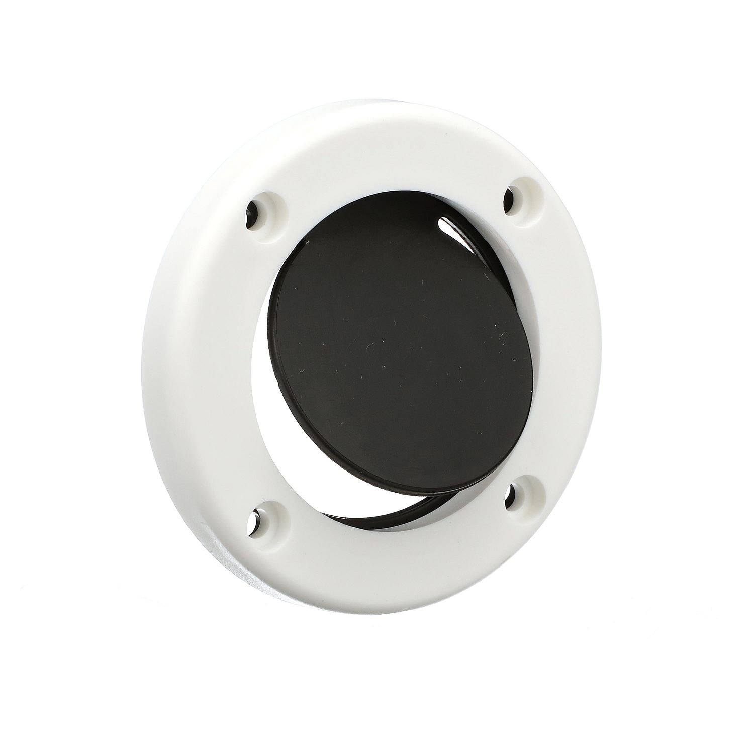 High impact fiberglass reinforced white plastic ring with rubber flap and gasket. For boats with self bailing cockpits. Mounts on transom above water line. Fastens with #6 screws.