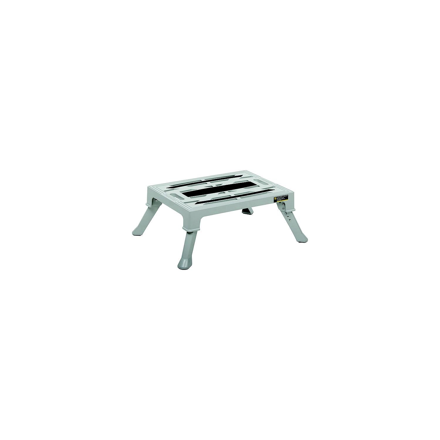 Lightweight, rust resistant, aluminum platform step. Works at two heights 3-1/8" (folded legs) and 8-1/8" (extended legs). Rubber feet on legs prevent platform from slipping, solid foot bottom prevents cut-through of rubber feet.