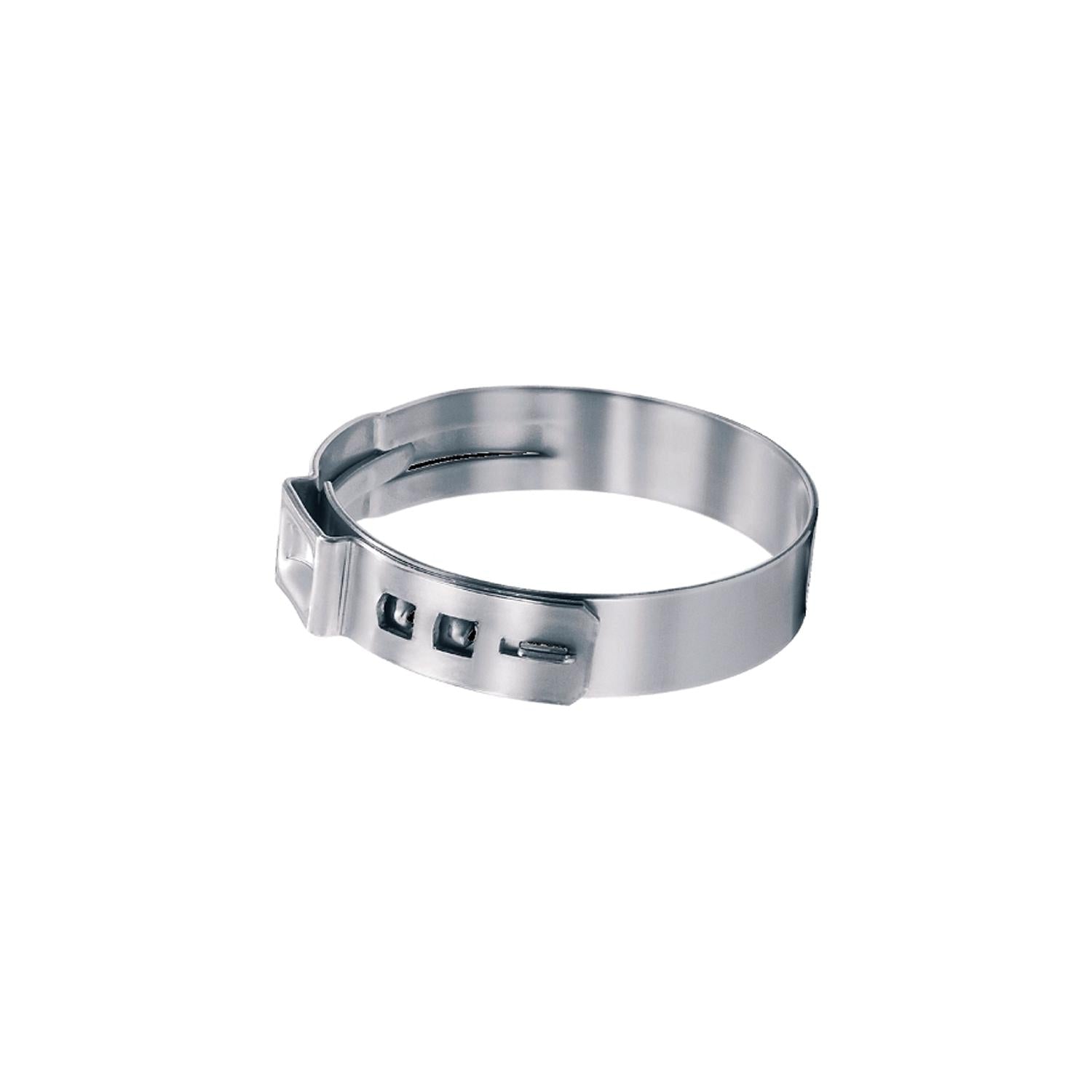 Oetiker one ear hose clamps with mechanical interlock. Specially formed strip edges reduce the risk of damage to the part being clamped. Mechanical interlock allows use of pre-coated materials. Available in key sizes. Uniform compression and increased clamping force. Features: All 304 stainless steel, Narrow band - 7mm,