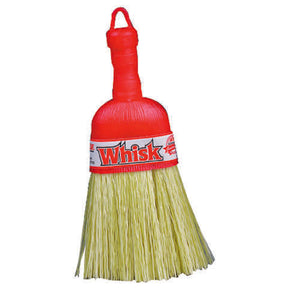 ACE Brand plastic whisk broom. Yellow poly fiber bristles bonded to a plastic red hang cap to store away. The broom comes with a printed hang tag with ACE logo and UPC.