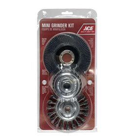 Ace Angle Grinder Kit includes flap disc for grinding and finishing, wire cup brush to remove rust and corrosion and a wire wheel for quick removal of paint and surface rust. Use on 4-1/2 and 5 in. angle grinders with 5/8 in. -11 threaded hubs.