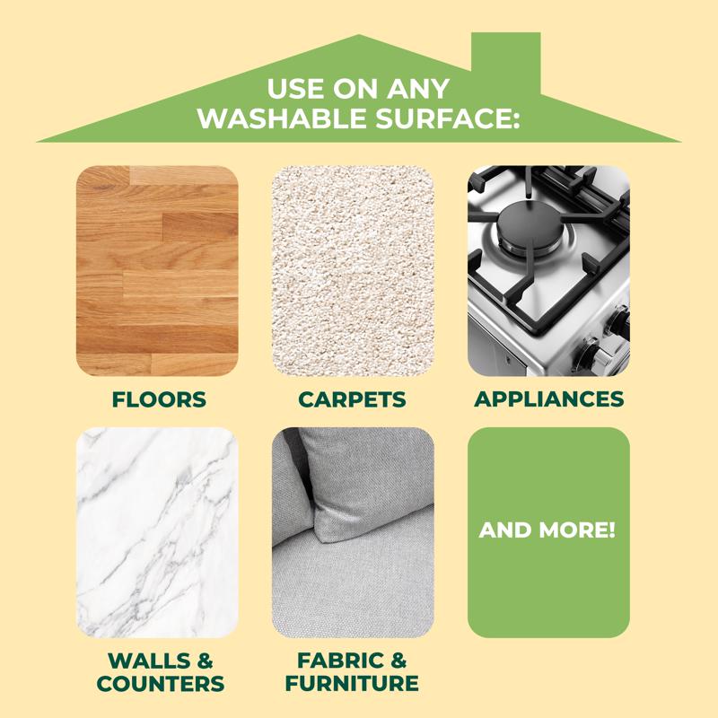 Cleans counters, carpet, floors, fabric, equipment and vehicles