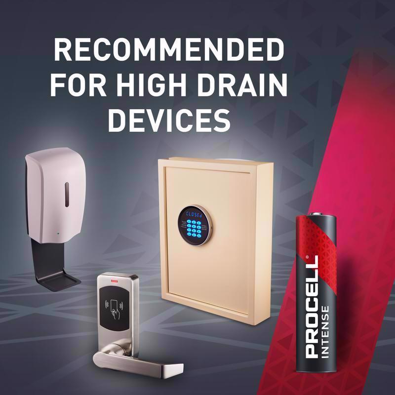 Procell Alkaline Intense Power AAA industrial batteries are specifically designed to last longer (vs. prior Procell Alkaline AAA batteries) in high drain professional devices that require a high amount of power or peaks of power, such as blood Pressure monitors, soap dispensers, pulse oximeters and flashlights.