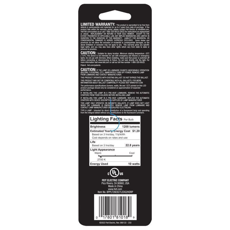 Upgrade your existing PL fixtures to advanced LED energy-saving technology with Feit Electric Triple Tube LED Bulbs. Shine a light on any task at hand with the PL LED lamp. This 4100K Cool White non-dimmable light is ideal for general purpose and task lighting. It replaces GX24q-3 4-pin 26-watt fluorescent bulbs. This energy-efficient lamp can produce 1200 lumens of light using 10 watts of electricity. This bulb has an average life rating of 25,000 hours/22.8 years and is mercury free. Choose a Feit Electric energy-saving bulb for dependable lighting in residential or commercial settings.
