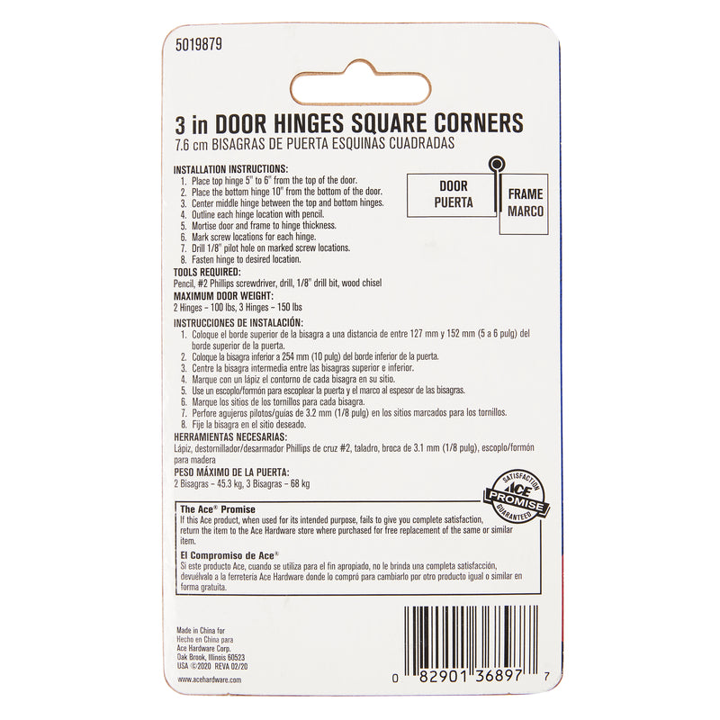 Ace residential hinges are a great choice for residential, commercial, window, furniture and a variety of other applications. 3 PACK