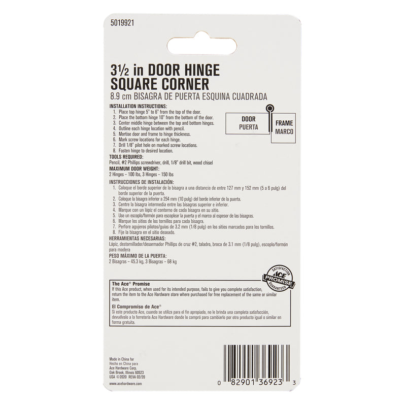 Ace residential hinges are a great choice for residential, commercial, window, furniture and a variety of other applications. 1 PACK