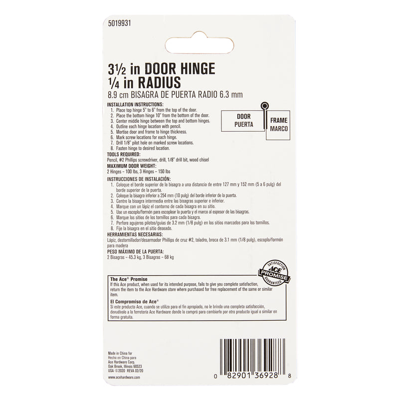 Ace 3-1/2 in. L Satin Brass Residential Door Hinge 1 pk
