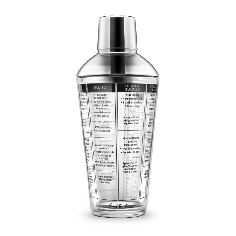 This recipe cocktail shaker kit includes essential bar tools for mixing up perfect cocktails. The lid features a built-in strainer that helps to separate ice from the cocktail when pouring.