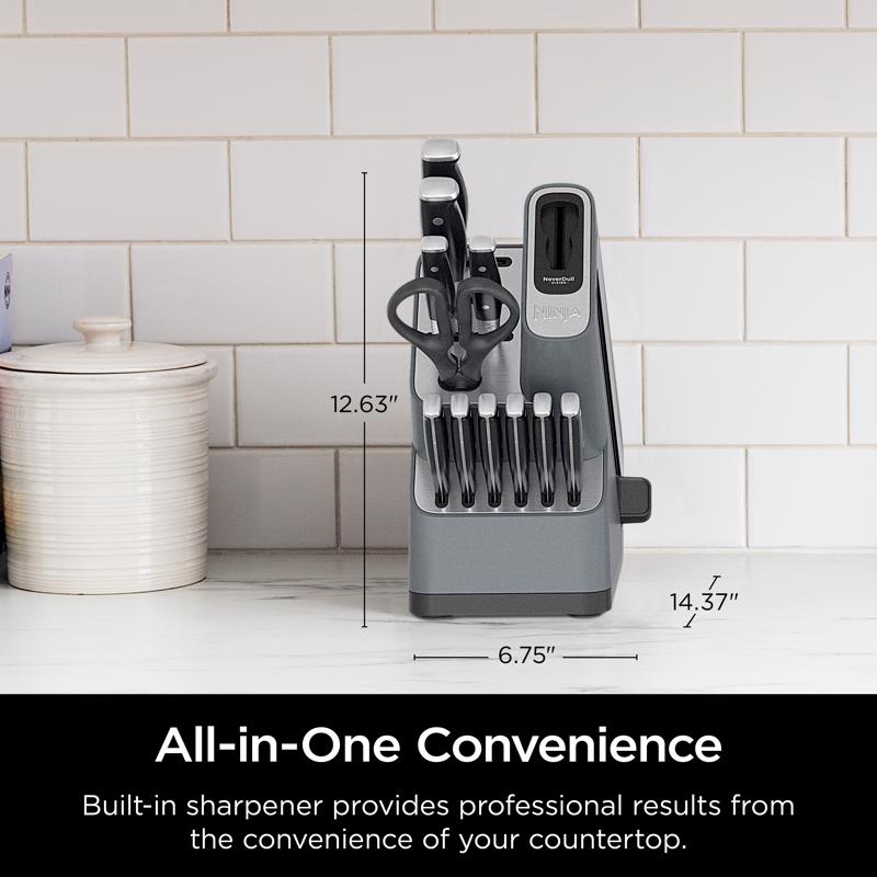 Introducing the Ninja NeverDull Black and Gray Premium Knife System, the premium knives that stay razor-sharp for over 10 years. This versatile set includes forged German stainless steel blades that are durable and perfectly balanced for comfort and control. With only a few swipes of the built-in foolproof sharpener, this all-in-one system maintains the superior sharp edge you crave use-after-use.