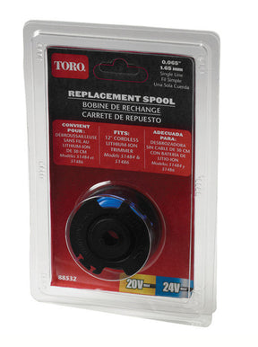 The Toro Replacement Spool fits model 51486 and 51484, 12-inch 24-volt and 20-volt lithium ion string trimmer. The 15 feet long dessert extrusion vortex single line provides longer life and less drag. *