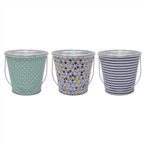 Our 18 oz. Geo Bucket Citronella Candles are a fun way to add bold patterns and colors to your outdoor decor. Each 3-pack comes with 1 candle in each pattern, a blue and white teardrop print, a red and white circular print and a yellow and white diamond print. The festive look of these buckets makes them perfect for outdoor parties and birthday celebrations. Arrange the buckets separately around the perimeter of your space to create a barrier of protection which will help keep the bugs away.