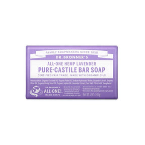 Scented with pure lavender and lavandin oils to calm the mind and soothe the body! Dr. Bronner's Lavender Bar Soap is made with certified fair trade ingredients and organic hemp oil for a soft, smooth lather that won't dry your skin. 100% biodegradable in a 100% post-consumer recycled wrapper.