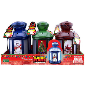 These lanterns are perfect as table centerpieces. 3 Assorted colors green with christmas tree design, blue with snowman design and red with santa design.