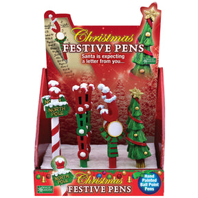 Hand painted with a decorated christmas tree with a gold star, a red and green ho ho ho covered in snow, or a red and green joy pen