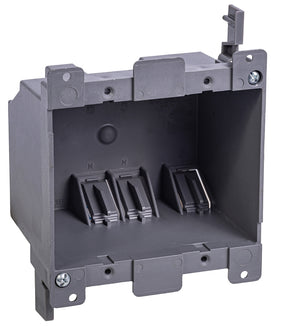 GB Switch/Outlet Box, Outlet Type: Standard, Cable Entry: Knockout, Number of Knockouts: 6, Number of Gangs: 2, Rectangular, Cubic Capacity: 25 cu-in, Dimensions: 4-3/8 in H x 4 in W x 2-3/4 in D, PVC, Gray, In-Wall Mounting, Suitable for: Non-Metallic Sheathed Cable and Non-Metallic Raceway, Includes: Mounting Ears/Flanges and Adjustable Mounting Tabs
