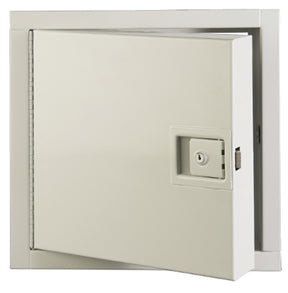 Flush mounted, with both anchor straps and mounting holes to facilitate installation. Insulated and rated by Underwriters Laboratories for 1.5 hrs "B" label in walls and may be used in a 2 hrs fire rated wall assembly. Rated for 3 hrs in ceilings by Warnock Hersey. 16 ga steel frame and 20 ga steel, welded pan door. Door filled with 2 in thick fire rated insulation. Door has automatic closure, is self-latching and has interior latch release.