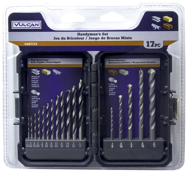 Plastic Case Handyman's Drill Bit Set includes 17 pieces. All sizes 3/16 in and larger have 3 flats on the shank so that the drill chuck gets a better grip on the drill bit.