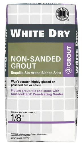 White dry non-sanded grout is formulated for grouting porous floor and wall tiles with joints up to 1/8 in wide. Ideal for use with glazed tile and polished marble that can be scratched by sanded grout. It can be used for interior and exterior applications.
