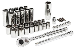 With standard and deep sockets, the Crescent 35-piece mechanics tool set is ideal for the garage. This set has the tools you need for all your engine work, including SAE and metric sized sockets, two extensions and a spark plug socket.