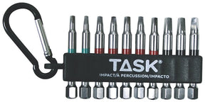 Proprietary modified S2 steel construction. Specially designed heat treatment cycle for durability. Unique down-turned shaft geometry for maximum impact resistance. Unique tip design made to Robertson specifications. 10-piece mixed set (Two #1, five #2 and three #3 bits) with carabiner clip.