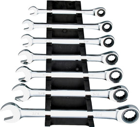 This ratchet wrench set includes 5/16 in, 3/8 in, 7/16 in, 1/2 in, 9/16 in, 5/8 in and 3/4 sized wrenches. The 72 tooth ratcheting box-end with 5 deg of arc is ideal in tight space conditions. The set is made of drop forged chrome vanadium steel with a mirror polish.