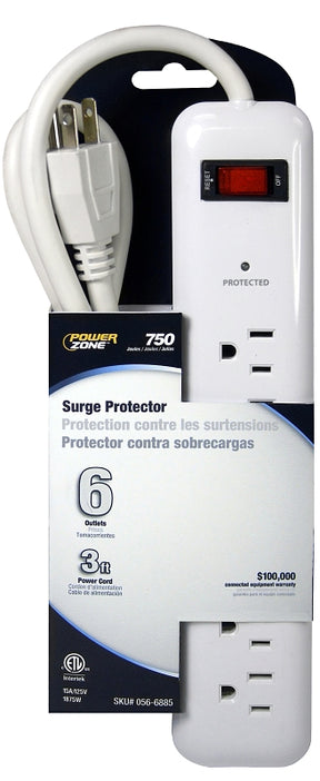 PowerZone OR802124 Surge Protector, 125 V, 15 A, 6-Outlet, 750 Joules Energy, White