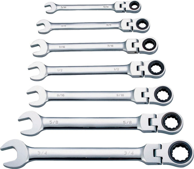 This wrench set includes 5/16 in, 3/8 in, 7/16 in, 1/2 in, 9/16 in, 5/8 in and 3/4 in sized wrenches. Its flex head tilts up to 180 deg, allowing access to the narrowest of working areas. The 72 tooth ratcheting box-end with 5 deg of arc is ideal in tight space conditions. The set is made of drop forged chrome vanadium steel with a mirror polish.