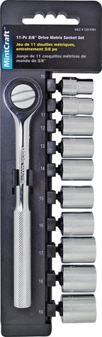 - Includes: 10 PCS 3/8 in Drive 6 PT Socket - 10 11 12 13 14 15 16 17 18 19 mm and 1 PC Ratchet Wrench