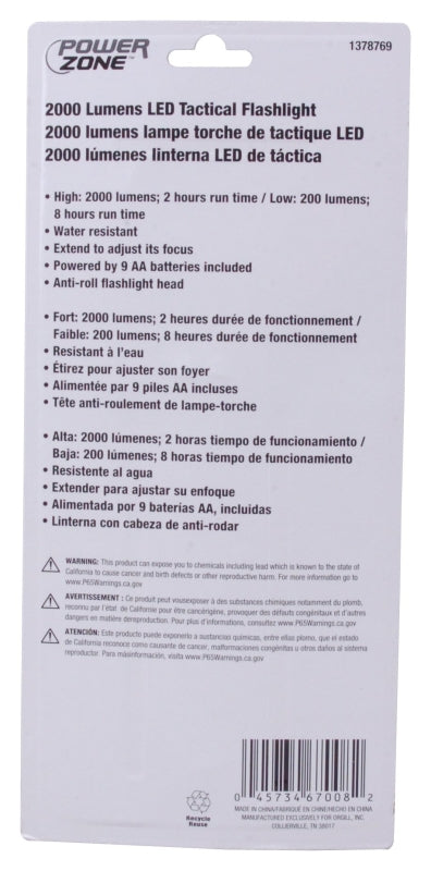 PowerZone 12139 Tactical Flashlight, AA Battery, LED Lamp, 2000 Lumens, 180 m Beam Distance, 8 hrs Run Time, Black is backordered and will ship as soon as it is back in stock.