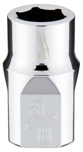 Our 3/8 in drive SAE 6-point socket with FOUR FLAT sides was designed from the ground up to be part of the most versatile socket family. Milwaukee 3/8 in drive sockets feature an innovative design with four parallel flat sides, which deter rolling and are wrench compatible. The SAE socket sizes are stamped into the flats providing you with improved, easy-to-read visibility. These deep and standard socket sizes have optimized geometry to reduce bolt rounding and stripping. We back all our 3/8 in drive SAE sockets with a lifetime guarantee. Our 3/8 in drive SAE sockets range from 1/4 to 1 in standard and deep well sockets.
