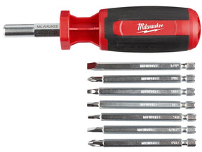 Our 9-in-1 square drive multi-bit driver features 3-1/2 in interchangeable power groove bits that are power tool compatible giving you maximum jobsite versatility. The multi-bit screwdriver also has wrench-ready hex shanks providing you with additional leverage. The interchangeable bits are precision machined and chrome-plated, providing marine-grade rust protection and reduced wear giving you the best jobsite durability. The screwdriver features magnetic bit retention providing you with consistent driving performance. The Milwaukee 9-in-1 square drive multi-bit driver is designed for the jobsite.