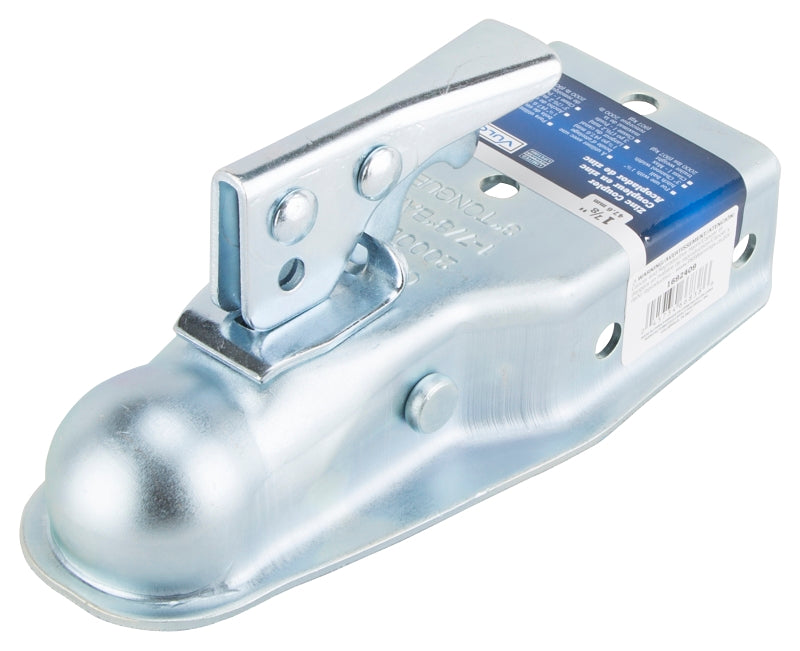 Vulcan Trailer Coupler, 2000 lb Towing, 1-7/8 in Trailer Ball, 3 in Channel Width, Lock Hole: 10.4 mm, Lever Latch, Steel, Zinc, Silver
