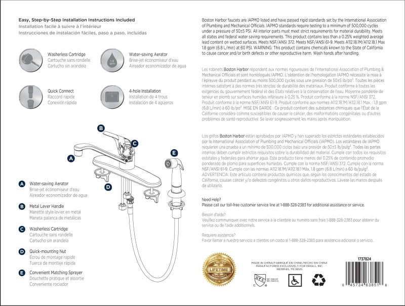 Boston Harbor FS610046CP Kitchen Faucet, 1.8 gpm, 1-Handle, 4-Faucet Hole, Metal/Plastic, Chrome Plated