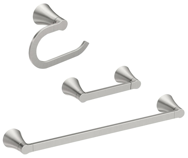 Made up of smooth, fluid curves, the Mikah collection offers a soft modern style that can add a touch of warmth to the bathroom. The three-piece accessory kit includes a 24 in towel bar, pivoting paper holder and towel ring to help complete the design of the space for a cohesive look. Available in Moen's exclusive Spot Resist brushed nickel, which resists fingerprints and water spots for easy cleaning.