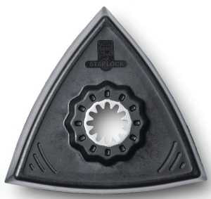 Standard version. Plastic carrier plate to prevent damage and marks on the workpiece. Triangular shape, hook-and-loop surface.