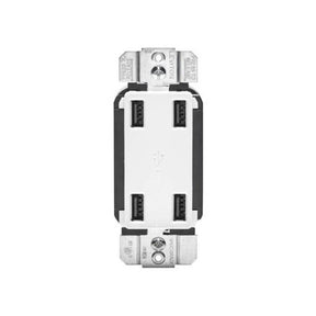 The Leviton USB4P offers four USB charging ports with a total of 4.2 A of charging power. This device has the ability to charge up to four devices, including multiple tablets simultaneously. The USB ports are Type A, 2.0 and are controlled by a microprocessor and smart chip that recognizes and optimizes the charging power of your device plugged in. This means you can spend less time charging your device and more time enjoying it. Our 4-port USB charger is ideal for charging tablets, smart and mobile phones, e-readers and much more.