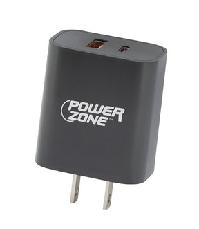 PowerZone PD+QC Dual USB Wall Charger has Type C & USB charger ports. It's used for charging cell phones or portable devices. Two devices can charge at the same time.