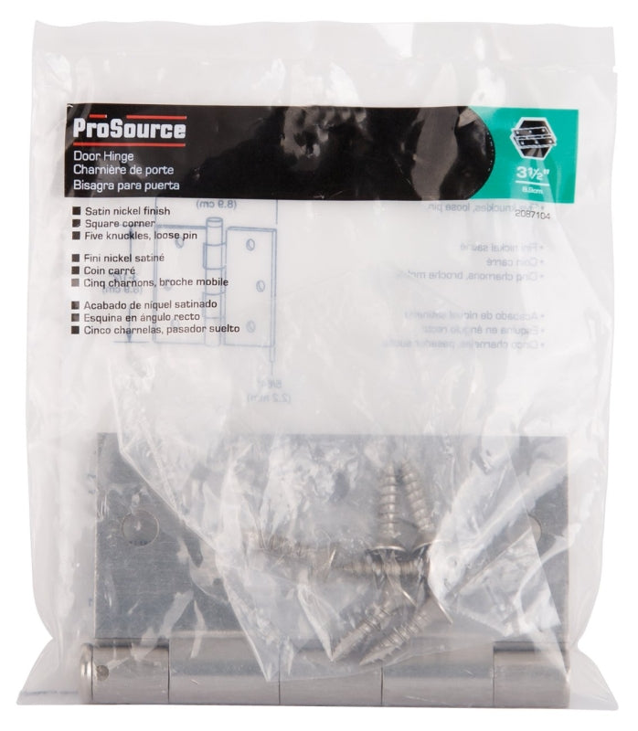 ProSource 20338SNX Square Corner Door Hinge, Steel, Satin Nickel, Loose Pin, 180 deg Range of Motion