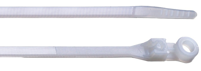 These cable ties are designed with a special mounting hole at the top of the tie which enables the user to mount or hang a bundle from just about anywhere. The hole accepts a #10 screw. Mounting ties are great for securing bundles of cables to studs, walls, ceilings or other surfaces. Also hang cords, tools and countless other applications with these great cable ties.