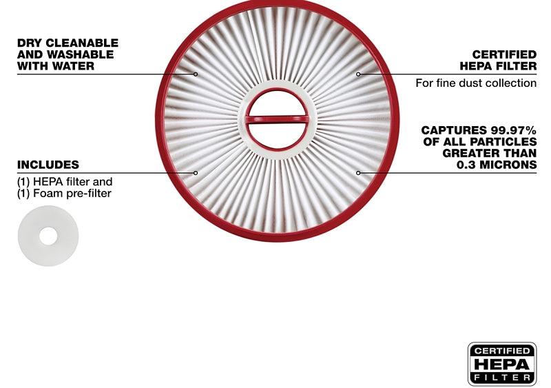Our HEPA filter is compatible with the M18 FUEL compact vacuum. This Certified HEPA filter is easy to install and captures 99.97% of all particles greater than 0.3 um for fine dust collection. This product contains one HEPA Filter and one foam pre-filter, which are both washable. We designed these products to be used together on the MILWAUKEE M18 FUEL compact vacuum for optimal performance.