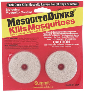 Kills mosquitoes before they're old enough to bite! The Mosquito Dunks are America's excellent selling home owner mosquito control product. The only product with BTI, a bacteria toxic only to mosquito larvae, that lasts 30 days and treats 100 sq-ft of surface water.