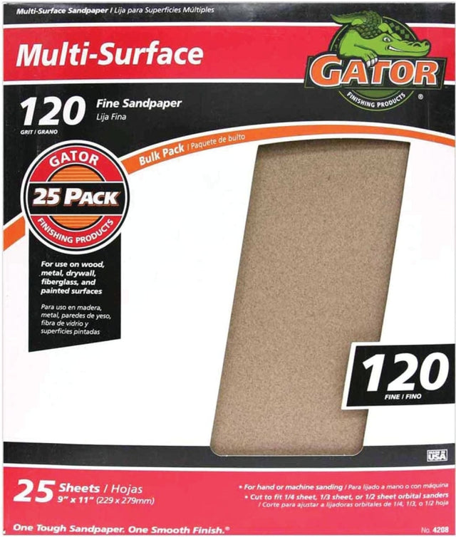 Gator's multi-purpose aluminum oxide sandpaper provides excellent performance at a value price. These sheets are ideal for both hand and power tool sanding on wood, metal, fiberglass and painted surfaces.