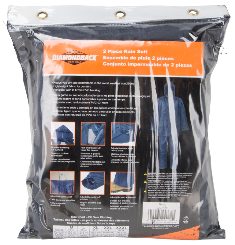 Diamondback SPU045-L Rain Suit, L, 29-1/2 in Inseam, Polyester, Blue, Drawstring Pull-Out Hood Collar