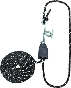 Rope ratchet with rope ratchet logo. Includes one 8 ft rope and one 3/16 in standard S-hook. Black rope with white tracers. Load capacity of 110 lbs.